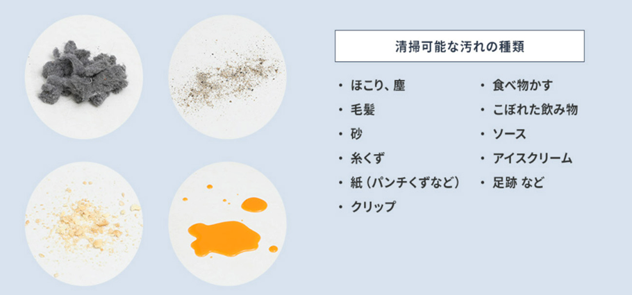 高速回転するローラーブラシによって液体汚れから固形の汚れまで、幅広い清掃が可能です。